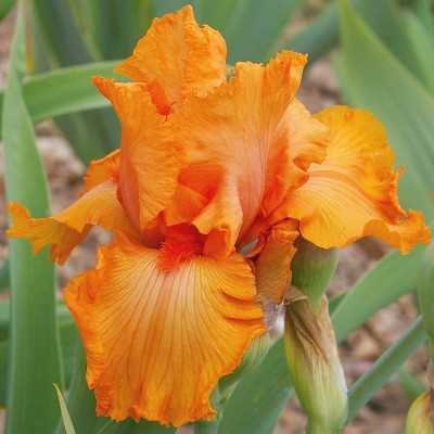 Erstaunliches, leuchtendes, strahlendes Orange, zwischen Mandarine und Möhrenfarbe, mit roten Bärten. Unserer Meinung nach das intensivste Orange überhaupt! Leicht gekreppte Blumen, mässige Grösse und zahlreiche Blüten (9 Knospen pro Stiel).
