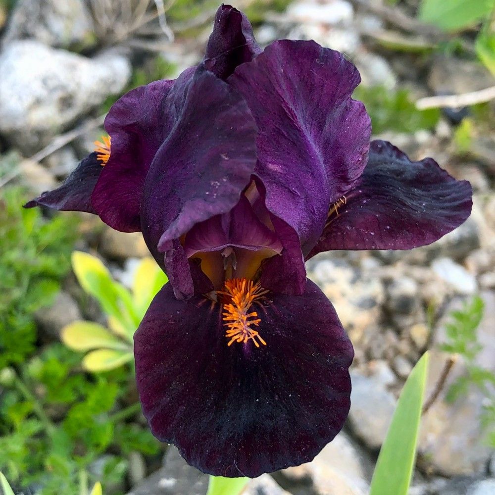 Weinrote Blütenblätter und schwarzrote Sepalen mit mandarinfarbene Bärte. Hervorragend!