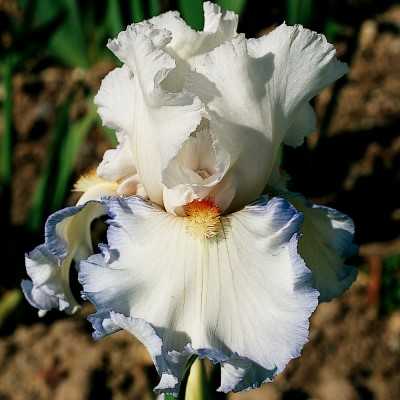 Procedente de "Rebecca Perret" y de "Sixtine C.", aquí tiene un blanco brillante muy delicadamente coloreado de azul suave en el borde de los sépalos. Flores de fuertes ondulaciones y barbas naranja. Esta pincelada azulada evoca este precioso glaciar de los Alpes: La Meije.