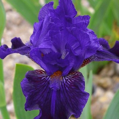 Pétales bleu poupré foncé, sépales bleu noir. Barbes vieil or à base pourpre. Léger parfum épicé.