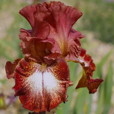 Superb recent australian import that brings great qualities to the plicata family. Reddish brown standards and falls with a creamy white ground and reddish brown stitched band. Beards between mustard and copper. Very ruffled flowers and up to 10 buds.