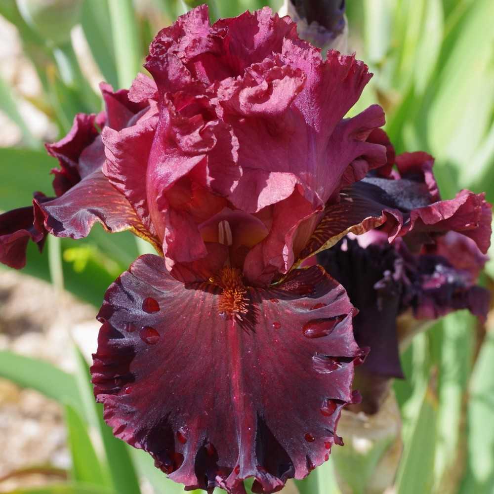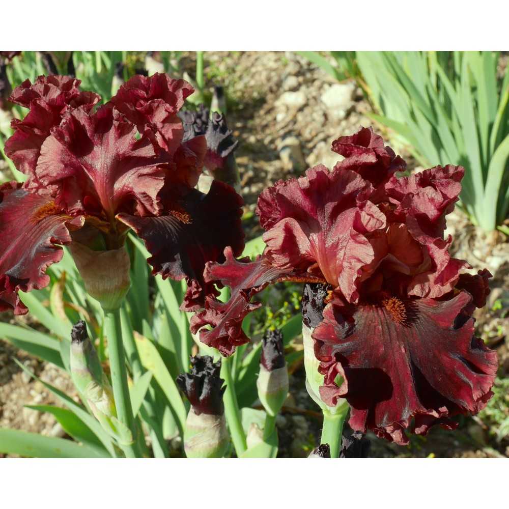 Se dovessi scegliere il mio preferito tra le mie creazioni 2018 sarebbe probabilmente questo. Ecco un eccezionale rosso 2 toni. Petali rosso bruno medio che si schiariscono un po' nel tempo, sepali rosso bourgogne scuro, più chiaro ai bordi. Forma ed innesto eccezionale, 8 bocci in media. Barba castagna media. (semina 06 33 A).
